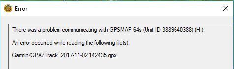Recently I have gotten an error when I attach my 64s to my PC running Basecamp, see the message shown in the attached JPG file. Prior to today the error seemed to be with older files still on my Garmin. If I deleted the indicated file from the Garmin unit's GPX file the message goes away.