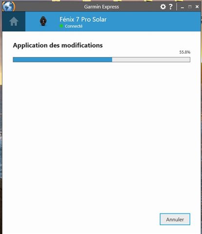 Je possède une Fénix 7 Pro Solar, et je n'arrive plus à télécharger des cartes TopoActive via Garmin Express avec cable USB relié à ma montre. Le téléchargement s'arrète à 55% après avoir laissé la montre relié plus de 24h00 au PC; j'utilise toujours Windows 10.