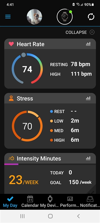 There is no more tab on the Garmin Connect Mobile Android app. That is only on the iOS app The equivalent on android is the hamburger menu (3-line navigation bar) on the top left corner.