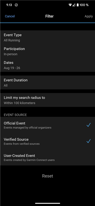 Cannot change Event filters, such as radius as the Apply button never activates after modifying filters.
