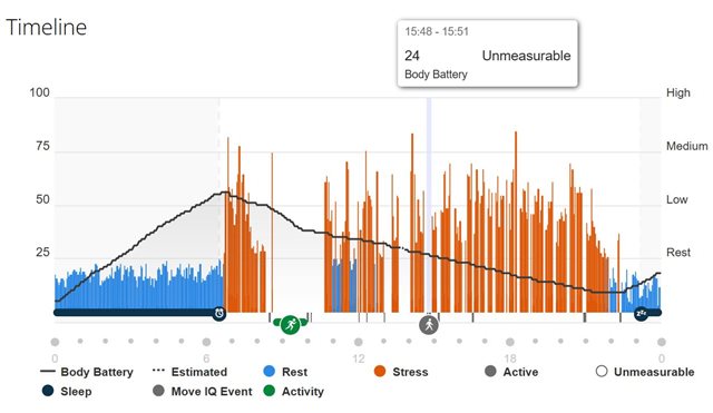 Although all rest periods are being shown on the watch, some of them don't show up in the latest version of GCM Android or GCWeb apparently. Instead, there are blank spaces of missing data between spikes of stress.