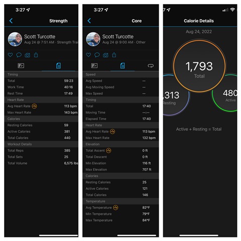 This morning I did two workouts. The first was a strength training workout in which I burned 381 ACTIVE calories (not resting or total). I then did a quick ab workout in which I burned 121 ACTIVE calories. Simple math says that upon concluding those two workouts I should have a minimum of 502 Active calories. However, when I check the Connect app on my iPhone, while the individual workout reports show the above active calories burned, when I look at my daily report it says that I’ve only burned 328 active calories. That’s 174 calories less than what my watch and the activities reported.