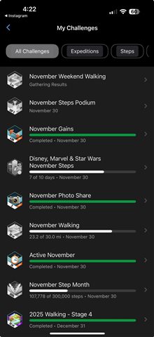 I'm hoping this is the right place for this question. For the past few months, I noticed that the challenge called "<Month> Weekend Walking" (i.e. November Weekend Walking) once completed would show in my Challenges as "Gathering Results". However, the following day it would just disappear. No credit for completion or no message saying it's still "Gathering Results". The last time I got this badge was back in July! I'm competing with friends and it makes it fun to see who can get the most points per month and leveling up. Is anyone else experiencing this problem?