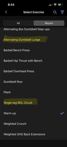 Other exercises which I do once a week get kicked off. For example, I updated the Exercises for this past Friday's gym session to select "Leg Press." Then I edited the Strength activity from Monday to select "Barbell Back Squat" because selecting "Leg Press" kicked it off the list. I regularly do Leg Press and Barbell Back Squat once a week so my expectation is that they remain on the Recent list. Yet somehow, Alternating Dumbbell Lunge and Single-leg RDL Circuit remain on the list when I haven't done them for months. "Weighted leg curl" also remains on the Recent list when I haven't done that in ages.