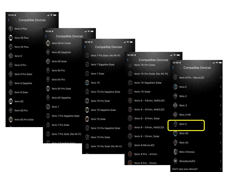 I had to scroll down through 5 levels in Garmin Connect on my iPhone 11 Pro before I could find my old Fēnix 5 in this list.