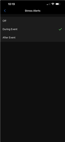 - Stress alerts are set to During Event in the Connect app