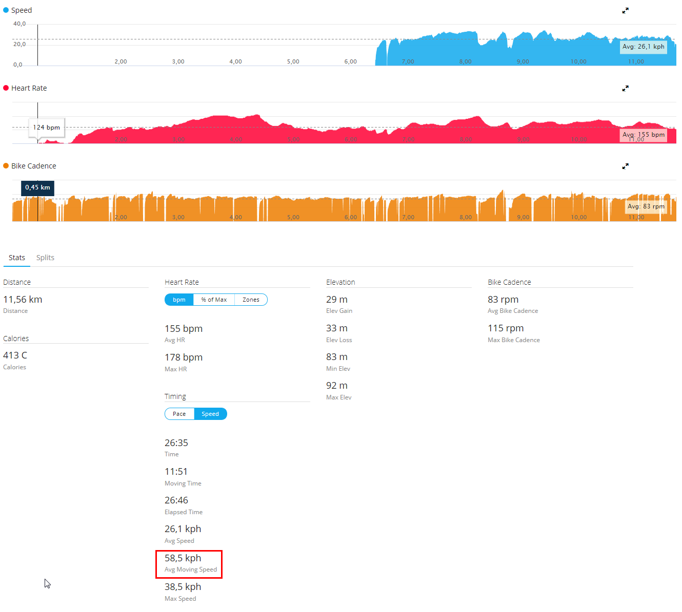 Almost 2 years passed and problem still not fixed or any useful information given.Speed data available since last pause only. I'm using Edge 705. Garmin Connect bugs are really frustrating. This bug does not allow to compare several races. Wow incredible 58,5 kph, I'm super fast.
