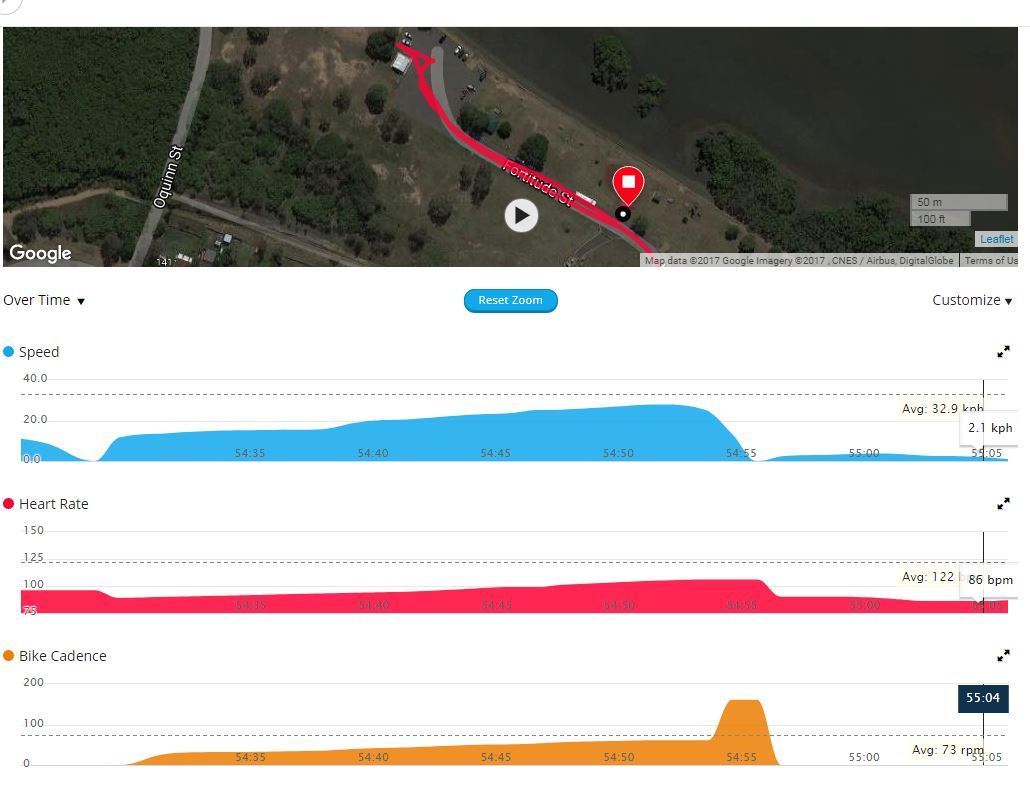 I can see no noticeable drop in Heart Rate in the Garmin Connect logs immediately before the fall - only after. From the clip below you can see the restart of the ride, an acceleration to nearly 28kms which is quicker than I though I was going, and then a quick drop in speed (obviously), subsequent lowering in HR and a spike in cadence presumably as my pedals spun while I fell (pretty sure I went over the bars with my feet still slipped in).