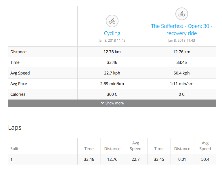 When I'm using the sufferfest and let it upload it's activities the average speed and distance gets all messed up. I've experimented a bit, and it seems to be caused by the sufferfest not including the Extenions/LX/AvgSpeed for each Lap. If I manually edit the file and add this, the import works. Seems like some calculation in the importer is relying on this field to be there, since even the distance gets messed up without it.