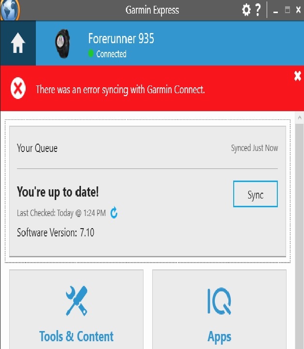 For almost two weeks when I sync my 935XT with GC, the blue bar just go half way, then an error message appears saying an error syncing with GC.