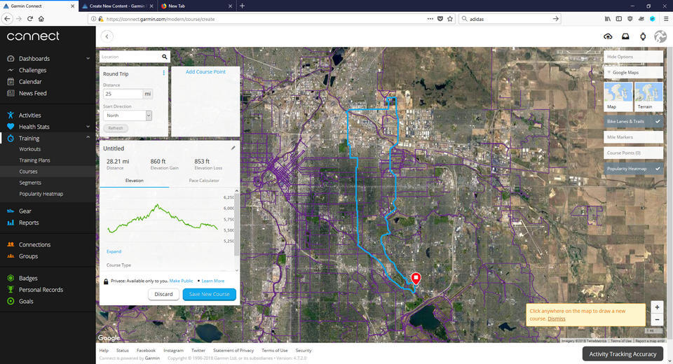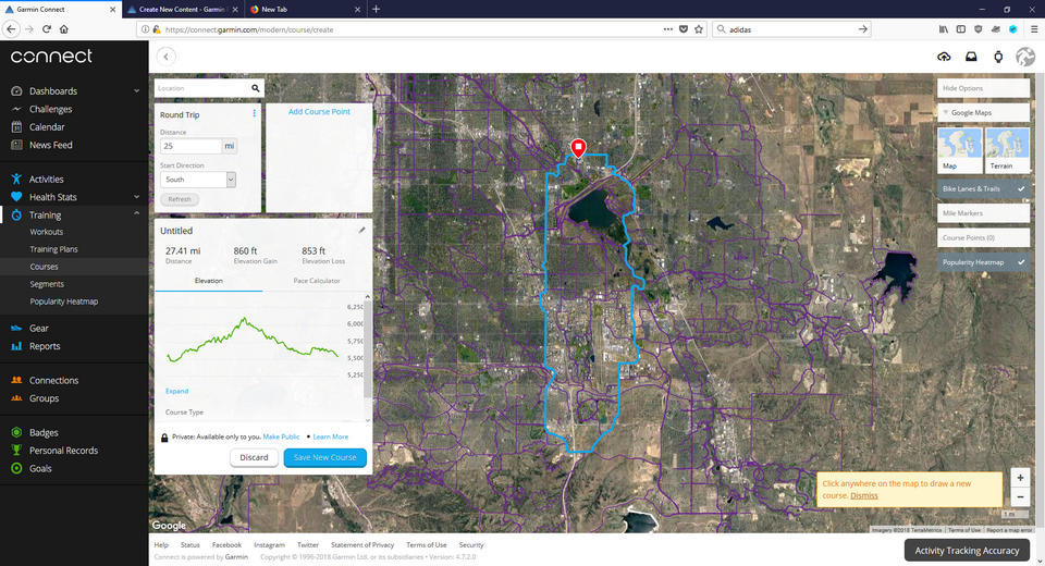 When I create a Round Trip course in the web application, it shows the plotted route on the map. It also shows a summary of the course distance, elevation gained, elevation lost, and an elevation profile along the route (Figure 1).