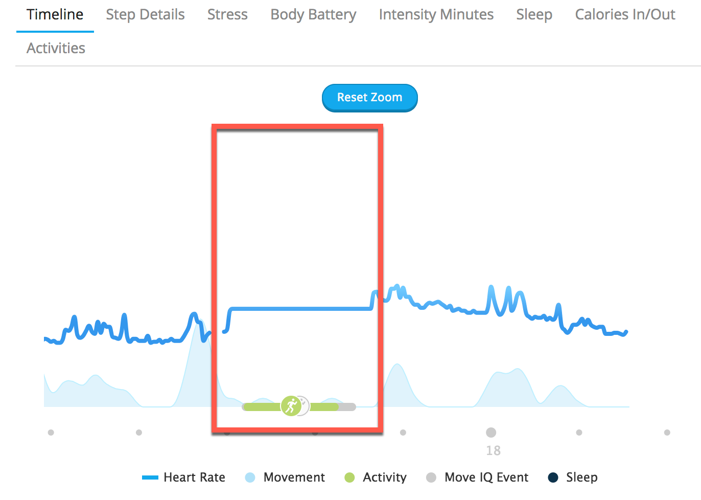 However when I checked the timeline for heart rate or step during the day, I saw a gap, either from the mobile app, either from the website. See attached picture (highlighted in red), I ran 10 km during 1 hour and my HR would have stay flat at ~100 during the whole activity (which is of course wrong, and can be checked from the activity details, everything has been properly recorded). Same for step count, no details visible during the run period, but I can see the step count during the period has been added to the daily total.
