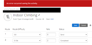 When I try to edit climb difficulty or number of falls, I get this error when trying to save. Multiple activities are affected - none will edit.