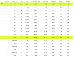 There's a bug that my first 20sec repeat which i have programmed into separate lap, gets mixed into base run and therefore avg pace and heart rate are not what they should be. from repeat 2 it works as it should. So that "Run 11" should actually be Interval number 2.