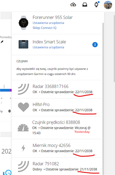 The problem occurred when I had the Edge 1000, one training session was saved on such a date. Now I don't have it anymore and I have the same sensors paired with my Forerunner 955, but the wrong dates are still there, so I can't see the actual battery levels. New battery readings are ignored because they are older than those from 2038. I have one new sensor, everything is fine with it.