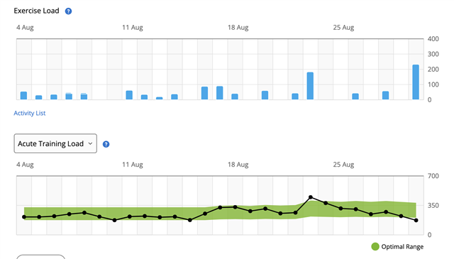 1) The Training Status metrics didn't update to reflect today's ride. E.g., the synthetic Training Status is shown as Productive, but clicking on the 4-weeks streak shows that today is still in Maintaining. More importantly, my Training Load is not accounting for the big load of today's ride, in a somewhat incomprehensible way; the activity list shows today's 220 load, but my Acute Load today declined down to 173 as if I did nothing (see screenshot). Note that the ride I had last Saturday (see the spike) is instead properly recorded and accounted for as it was recorded with the watch.