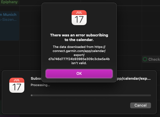 The calendar was working fine until recently (a day or two) - now it is not working, and when I try to remove and add again, I get the following error message: