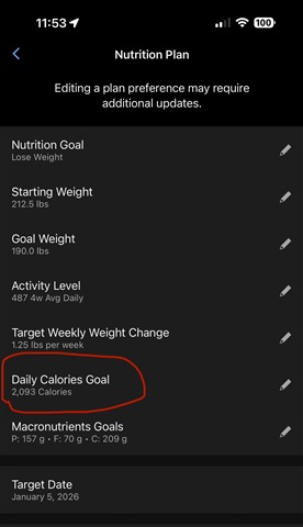 Nutrition Plan calorie target doesn't update daily tracker