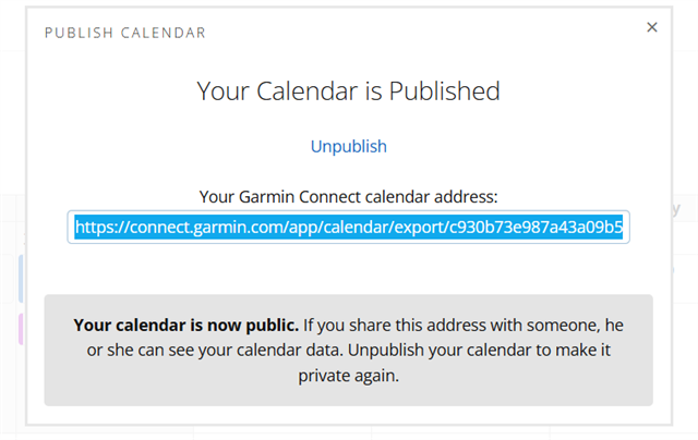 I am trying to publish my Garmin calendar so that I can see my upcoming events in my Google Calendar. I've hit the three dots, published, and selected all of the link. I've made sure to wait 24 hours for the data to populate, to no avail.