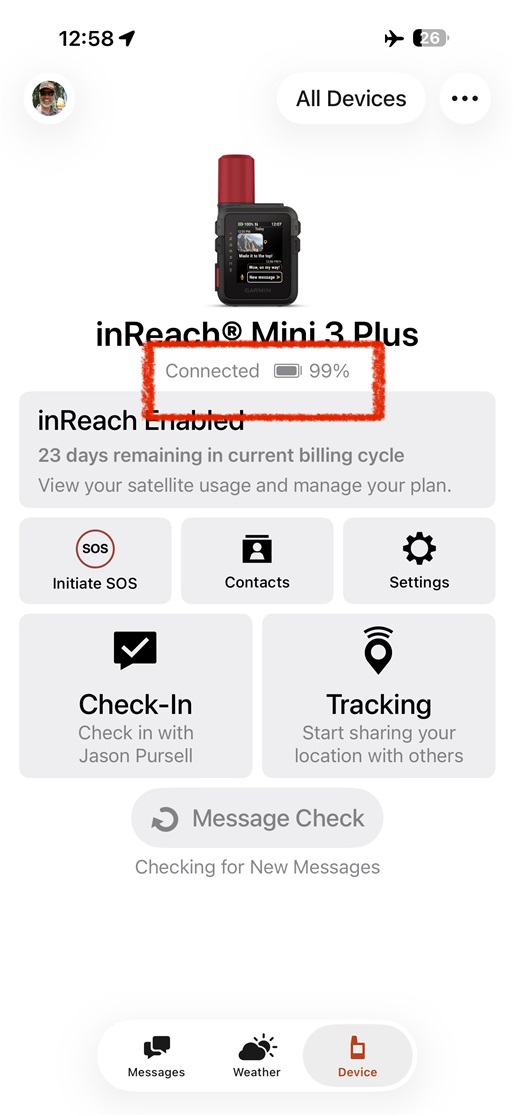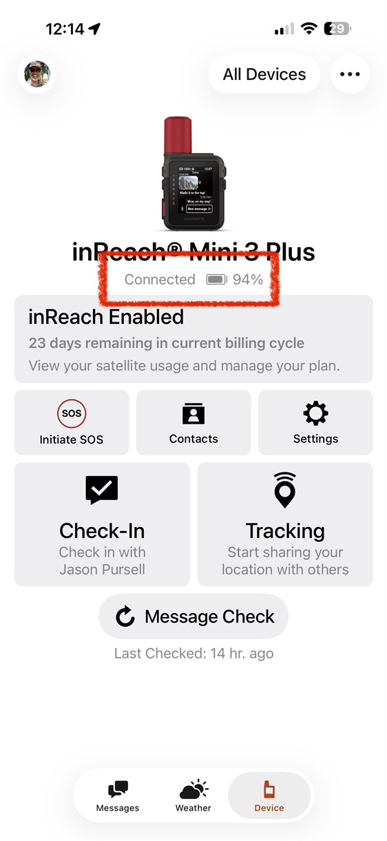 Observed: The battery percentage is lower in the Messenger app than it is on the InReach device. In my case the Messenger app read 94% while the InReach read 100%.