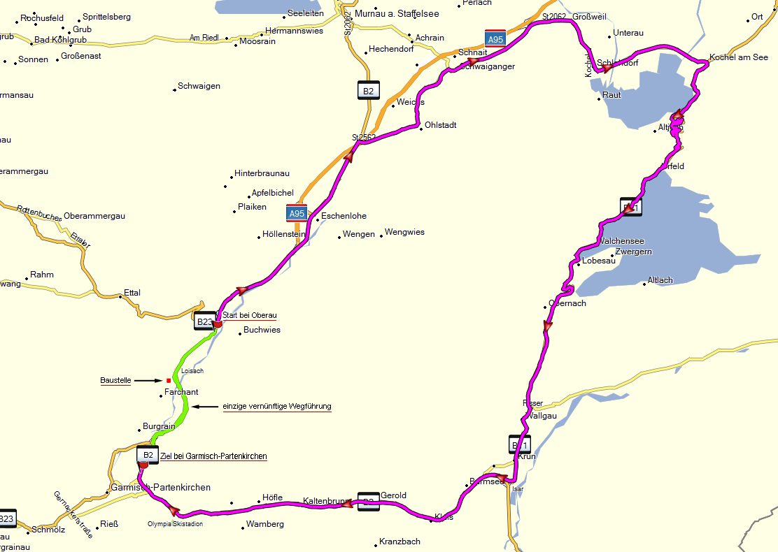 Was passiert nun aber, wenn nördlich von Farchant aus welchen Gründen auch immer, die Durchfahrt wegen einer Baustelle (Punkt N47° 32.193' E11° 06.916') gesperrt ist. Für BaseCamp kein Problem. Man fährt eben von Oberau über die B2 in Richtung Norden, umrundet den Kochelsee, fährt zum Walchesee hoch und weiter über Krün kommt man wieder auf die B2, auf der man nach einer Fahrzeit von 1 Std. und 14 Min. schließlich doch noch das Ziel erreicht. 68 km hat man zurückgelegt.