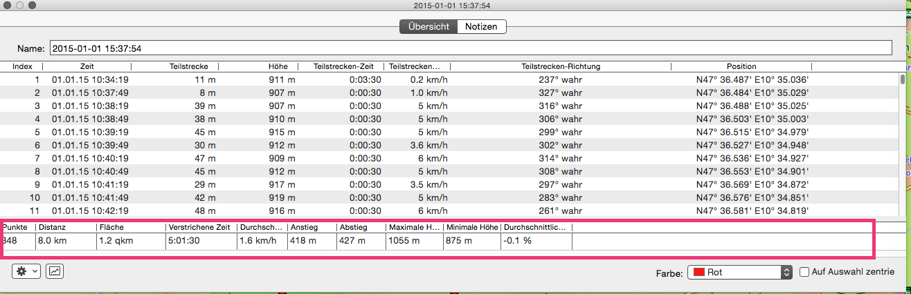 Wenn ich den Track von meinem 62st auf Basecamp übertrage und mir dann die Track-Übersicht anzeigen lasse, bekomme ich am Ende eine Zusammenfassung: Anzahl Punkte, Distanz, Verstrichene Zeit usw. Sh. Screenshot: