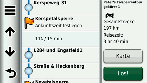 Nun passiert es mir dabei ab und zu, dass ich einen Wegpunkt in eine nicht befahrbare Straße setze und dann auf der Tour an einem Durchfahrt Verboten-Schild stehe. Prüfe ich dann nachher am Computer die Stelle, scheint die Map schon zu wissen, dass ich da nicht lang dürfte, sie warnt mich aber leider nicht, wenn ich einen Wegpunkt in die Verbotsstrecke setze. Setze ich keinen Wegpunkt in der Verbotsstrecke, führt es mich im großen Bogen drum herum.