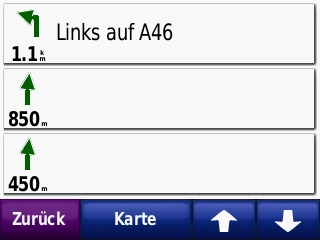 Zwischen den eigentlichen Abbiegeanweisungen (mit Text) mischen sich völlig überflüssige Anweisungen zum Geradeausfahren (ohne Text), die auch in der Dachzeile der Kartendarstellung leer erscheinen.