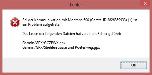Seit 3 Wochen hat meine Freundin das Dakota 20, ich ein Montana 600. Beide unterstützen die Funktion, dass Objekte wie Geocaches, Tracks usw. von Gerät zu Gerät gesendet werden können, eine sehr praktische Funktion. Leider ist es so, dass alle empfangenen Objekte in BC nicht erkannt werden. BC (neueste Version) quittiert das mit einer Fehlermeldung.