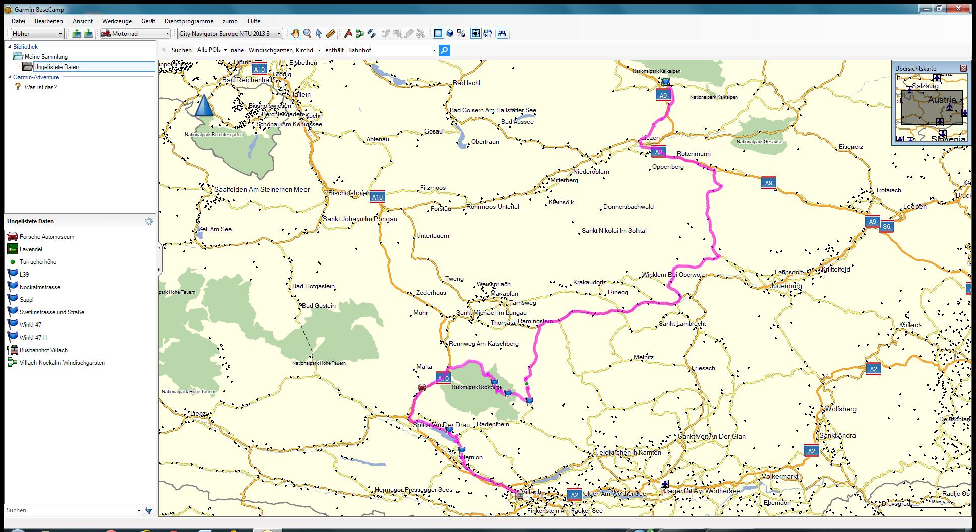 Fürs nächste Jahr wollte ich von Villach aus eine Route via Spittal, Innerkrems, Nockalmstrasse, Turracher Höhe bis Windischgarsten planen. Dazu habe ich am Anfang der Nockalmstrasse einen WP gesetzt. Bis dahin wurde die Route korrekt erstellt, nur am Wegpunkt Nockalmstrasse schickt BC mich nach Innerkrems zurück und routet über Muhr wieder auf die geplante Route auf die Turracher Höhe bis zum zweiten WP Nockalmstrasse bei Ebene Reichenau. Hier wird gewendet, das Ganze zurück Richtung Stadl an der Muhr.
