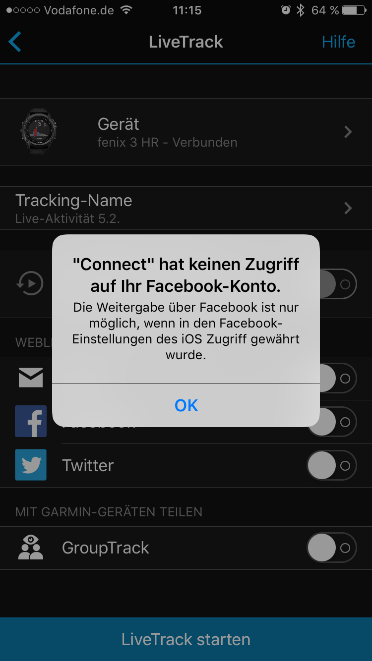 Einstellungen > Facebook > "Diese Apps dürfen deinen Account benutzen" > "Garmin Connect" einschalten