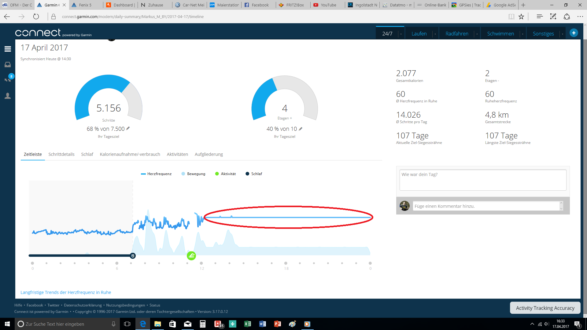 ich habe das Problem, dass nach Synchronisierung meiner Fenix5 über Bluetooth und der App, ab dem Zeitpunkt der Synchronisierung bis Tagesende eine gleiche HF Linie sichtbar ist, die sich aber auch durch erneutes Synchronisieren nicht verändert. Außer die tatsächliche HF ist höher als diese Linie.