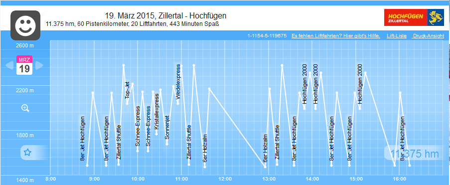 Die Liftfahrten, Höhenmeter und Kilometer hat er ganz gut erfasst.