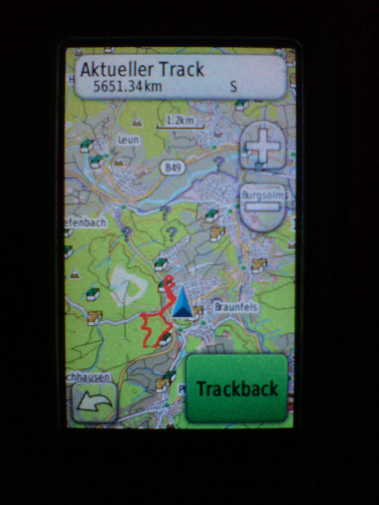 Ich laufe etwas durch die Gegend (vorzugsweise als Test im Garten *g*) und rufe dann den somit aufgezeichneten Track auf ([Menü ->]Track Manager -> Aktueller Track -> Auf Karte anzeigen). Nun steht oben im Kasten "Aktueller Track" mit "5651,31 Km".
