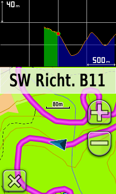 Damit bekommen Sie auf der Kartenansicht das Höhenprofil der Strecke vor und nach Ihnen angezeigt. Daraus kann der bis zum Ziel anliegende Abstieg/Anstieg abgelesen werden.