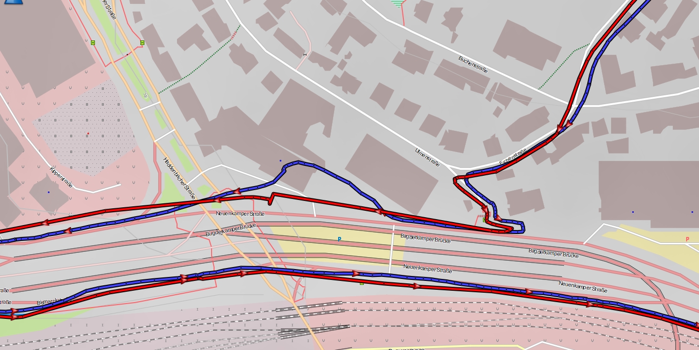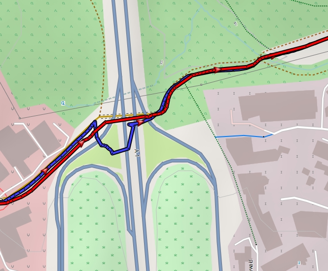 Hier fahre ich zügig unter einer Autobahnbrücke, hier hat Edge 550 (blau) total versagt, eTrex35 (rot) dagegen top!