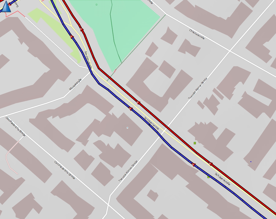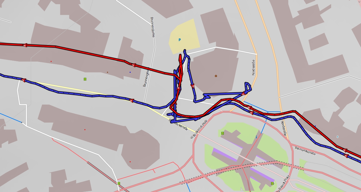 Hier fahre ich rechts, so macht eTrex 35 (rot) auch, Edge 550 (blau) dagegen fährt aber links.