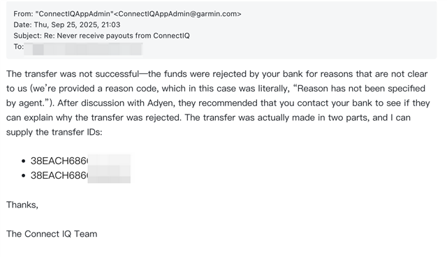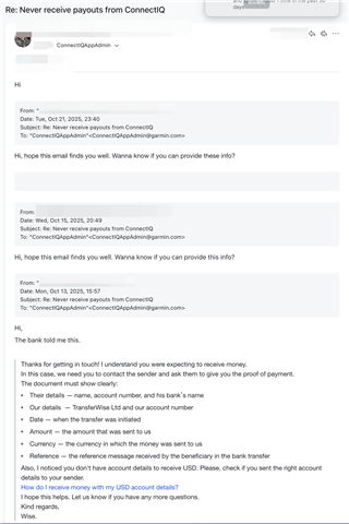 Hi,according to the information provided on developer.garmin.com, developer payouts are scheduled to be processed at the beginning of each month.