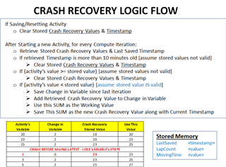 For example, say you are maintaining something simple like the Lap Count (increments every time the lap button is pressed). And you'd like that counter to be accurate after a crash. This seems to be the best way to handle this... Your app's lap counter will restart at 0, even if, say, you were on lap #6. So, when your app's counter says 3, you are really at 9. And to handle a 2nd crash, you need to continue to save the current working value (eg: 9). So to generate the accurate working value, you need to add the Crash Recovery Value to the "change" in the current value.