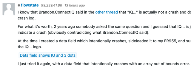 It was only in 2026 that it was explicitly mentioned by Brandon.ConnectIQ that (supposedly) "IQ!" gives you a crash log and "IQ..." does not, and that context does not appear anywhere in this thread.