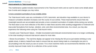 It looks like they may have improved their Grade metric (probably using some of my techniques). But it also looks like they have moved the tradeoff point to introduce significantly more latency in the total ascent metric. My data field should remain unaffected, since I use altitude (really it should be called elevation) in my algorithm. But I'm curious if anyone has compared the two ActiviyInfo metrics: (altitude vs ambientPressure) to derive a near real-time elevation that has less noise. For point to point changes in elevation over just a few seconds, weather induced barometric drift doesn't really come into play, so I can't imagine a scenario where vertical GPS is better than a barometer (unless the barometer isn't available or is broken/blocked). So deriving change in elevation using ambientPressure might be better. Any thoughts? Garmin-Matthew