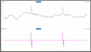 I finally solved the GRADE issue. I ride in Florida on mostly flat roads with very subtle elevation change. But the barometer is problematic. The "noise floor" on my EDGE 1050 causes a variation of +/- 3-5 ft over a 30-40 sec rolling window. My Forerunner 955 is +/- 7-12 ft. So what worked really well to eliminate spurious grades (flat road detection) was to maintain a queue of the last N elevation readings, generate a max/min value and assume a flat road if max-min < X. This shows the first 30 miles of my ride this morning. Blue is the EDGE 1050 barometer. It was essentially a flat road other than two overpasses over SR-528 at about a 3.5% grade. The data field rejected the noise but quickly detected true gradients.