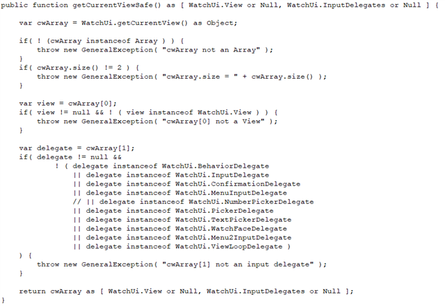 While investigating crash reports that appear to originate from WatchUi.getCurrentView(), I started working on a safe wrapper that explicitly validates all returned types.