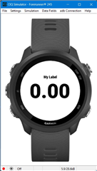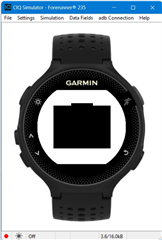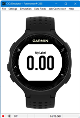 4) run app in sim for fr235, observe that output is corrupt. Instead of showing "My Label" and 0.0 as the code suggests, the simulator instead shows a large deformed rectangle (screenshot will be posted in a comment). Copy the PRG generated from this build to a safe place with a different filename