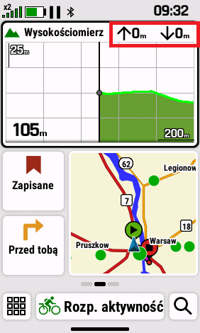 As can be seen in the promotional photo of the device, the altimeter displays two areas: the elevation profile already covered is shown in green, and during active navigation, the upcoming elevation profile is shown in blue.