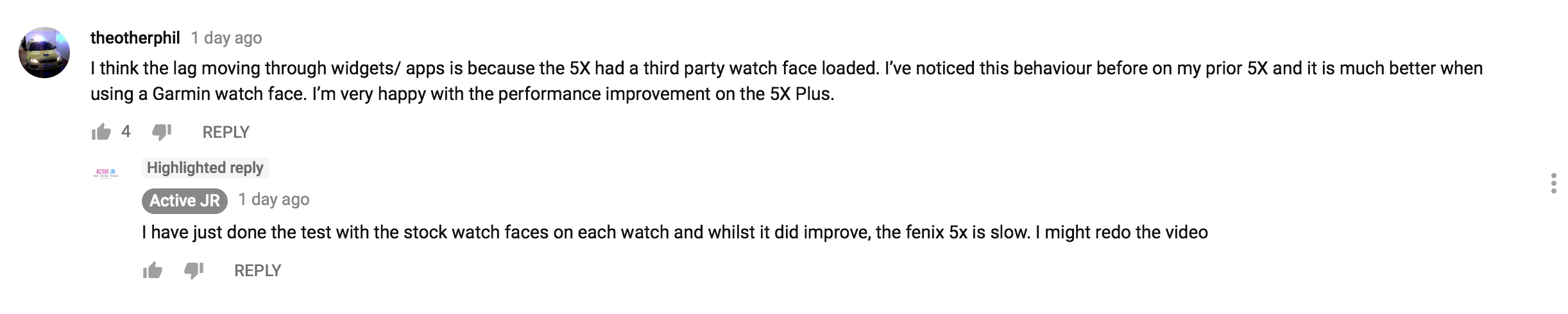 Just an observation, given that it is "known" that current firmware builds are suffering lag when using CIQ watchfaces, there is absolutely no point in making a video comparison claiming there is noticeable lag between the two when the plus version is running a Garmin built in watchface and the original 5x running a CIQ custom face. The plus clearly has a significant advantage for this reason.