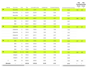 - Warm up average power 353W, average pace 06:24s, total time 12:01, distance 1,88km, best tempo 05:29