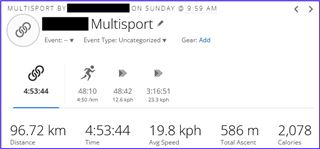 At the end of the race I stopped the multisport activity as always and a couple of minutes later I saved it. Having a look at the watch another couple of minutes later I didn't see the normal results screen with all the stats, but the starting screen of the duathlon activity... Something obviously went wrong...