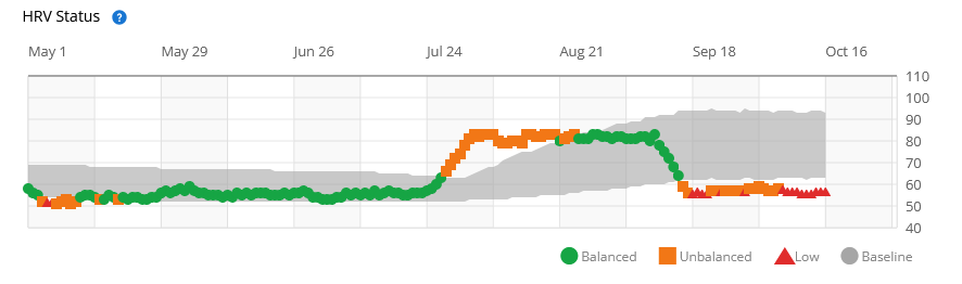 Gramin Instinct 2 watch. Why did my HRV suddenly rise starting July 27, and went back to normal after Sep 10.