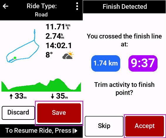 If you are following a course and have this feature enabled then if you ride past the end point of the course for more than 2 minutes and then go to save the activity it will give you a prompt to ask if…